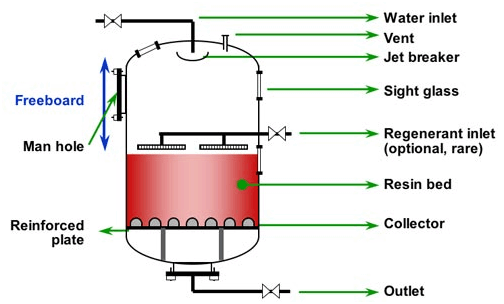 - The water enters from the top of the column. So as not to disturb the surface of the resin bed, the incoming water stream is stopped by a simple jet breaker.