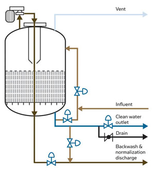During the backwash cycle, the backwash inlet and backwash outlet valve is opened. The backwash outlet valve is closed after 15 second. After closing the backwash outlet valve, Scrubber pump is started. The media inside the vessel gets fluidized during this phase and starts passing through the scrubbing pump as well as scrubbing section. When media is fully fluidized after 1 minute, the backwash outlet valve is again opened to let out the dirty water for 10 minutes. Once discharge step is completed, the next step of settling starts. In settling step all the valves and drives are closed and the fluidized media is allowed to settle down. After settling Step, Purge step is carried out. In purge step the Water passes through media in downward direction and is taken out from Purge outlet line so that residual dirt in the vessel is taken out and Media is fresh for further filtration.